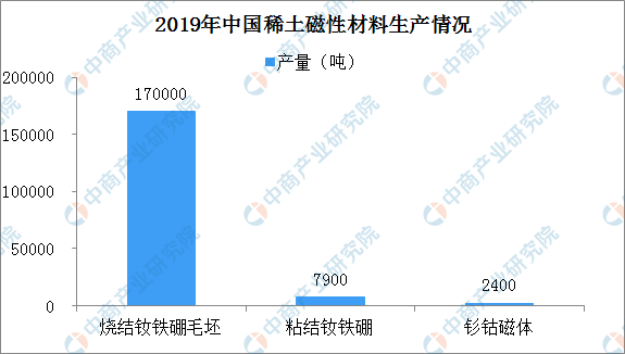 据中国稀土行业协会消息:2019年,稀土磁性材料产量保持平稳增长。其中,烧结钕铁硼毛坯产量17万吨,同比增长9.7%;粘结钕铁硼产量7900吨,同比增长5%;钐钴磁体产量2400吨,同比增长4%。